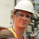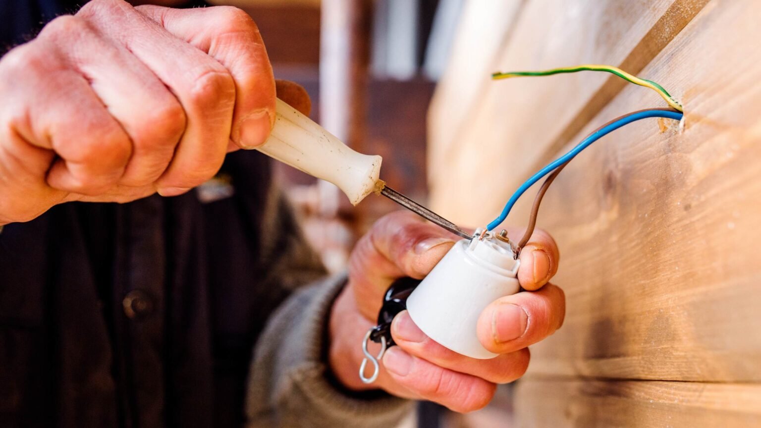 Electrician working on electrical panel with orange safety helmet and gloves, using a screwdriver to repair wiring inside the control panel.